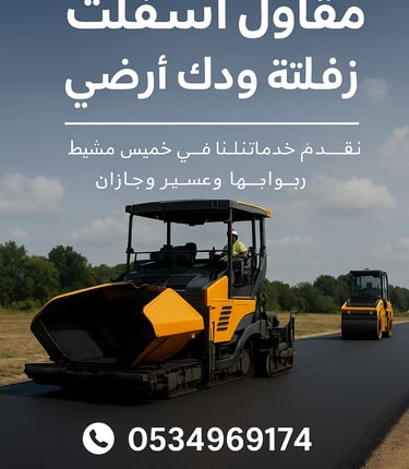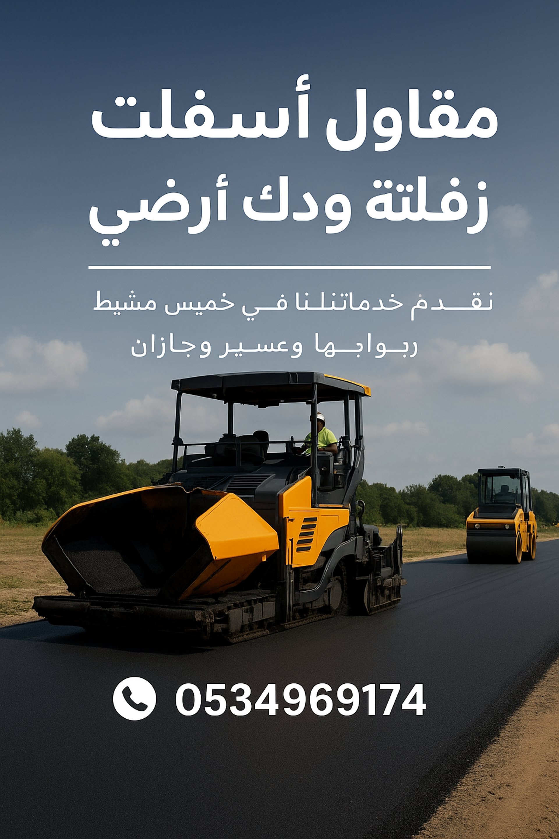 "مقاول أسفلت متخصص في تنفيذ جميع أعمال الزفلتة ودك الأراضي باحترافية عالية وباستخدام أحدث المعدات. نقدم خدماتنا في خميس مشيط، أبها، وكافة مناطق عسير وجازان مع الالتزام بالمواصفات والجودة المعتمدة. لدينا خبرة واسعة في إنشاء الطرق، مواقف السيارات، الساحات العامة والخاصة، بالإضافة إلى معالجة وصيانة طبقات الأسفلت القديمة. هدفنا هو تقديم حلول متكاملة تضمن القوة والمتانة مع أفضل الأسعار التنافسية. إذا كنت تبحث عن مقاول أسفلت موثوق ينفذ مشروعك بدقة وسرعة، اتصل بنا الآن على 0534969174 واحصل على خدمة عالية الجودة تلبي احتياجاتك."